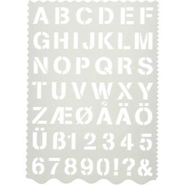 Skabelon i hvid plast med bogstaver, tegn og tal, A-Å + 0-9 - Str. 21x29 cm - Talhøjde: 25 mm