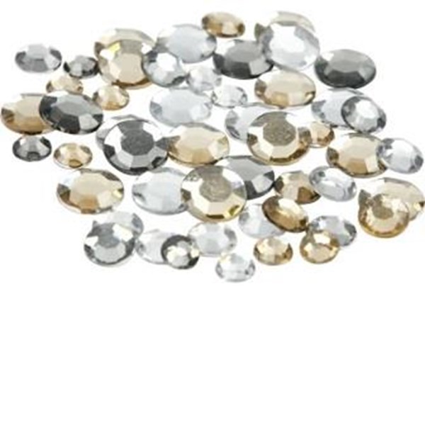 Sortiment af rhinsten i 3 forskellige størrelser med facetslebne kanter og flad bagside.