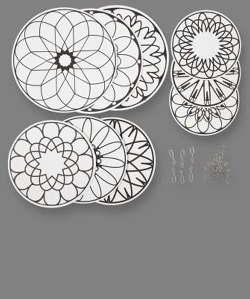 Udstansede, runde skiver af kraftigt karton (300 g) i 3 forskellige størrelser. Metalophæng med svirvel til montering medfølger