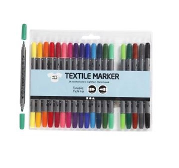 Permanente tekstiltusch i god kvalitet med dobbelt, fast filtspids. Rystes før brug. Strygefixeres og tåler derefter mild vask ved 40 °C.