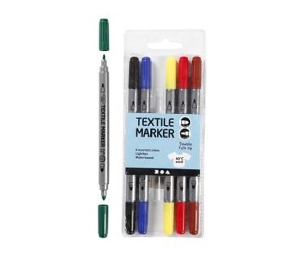 Permanente tekstiltusch i god kvalitet med dobbelt, fast filtspids. Rystes før brug. Strygefixeres og tåler derefter mild vask ved 40 °C.