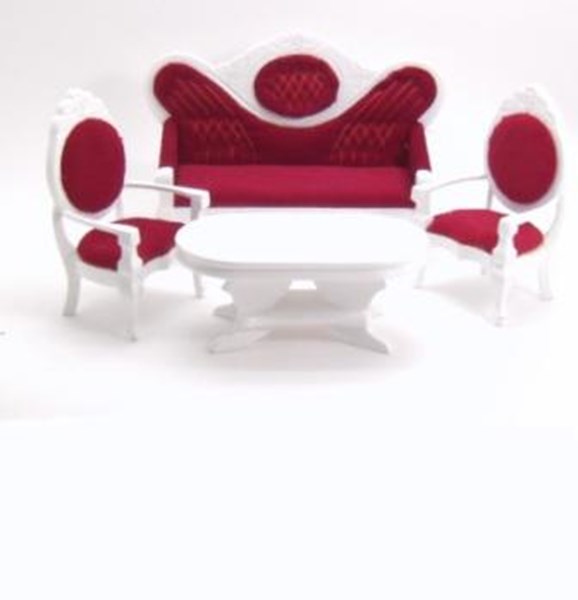 Sæt indeholder sofa, 2 stk. stole og et bord - hvid malet med mørk rød velour stof