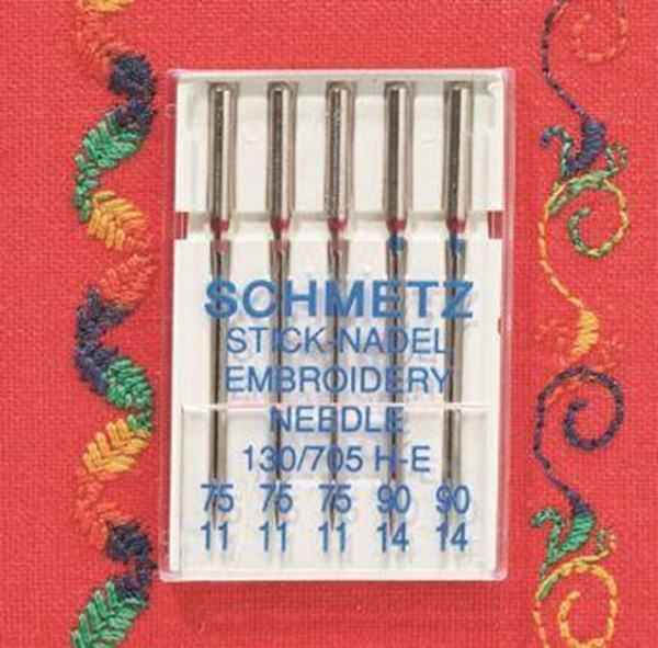 Schmetz 130/705 H-E - Let ball-point spids sikrer perfekte broderi-sting og et ekstra stort øje gør det muligt at få plads til tykke elle uldne tråde. Specielt velegnet til broderi