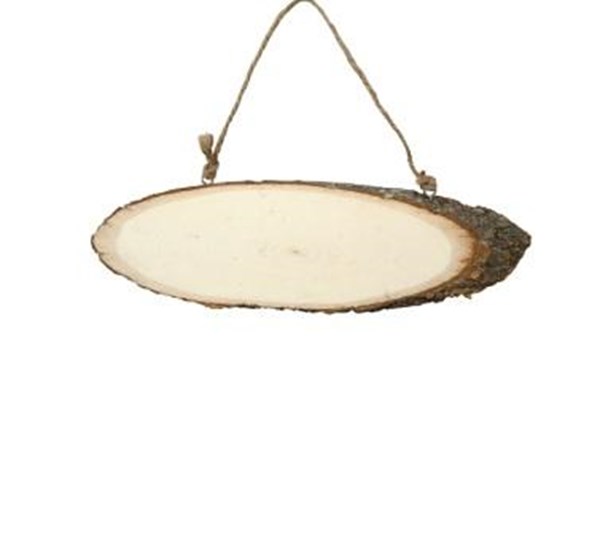 Skråtskåret træskive med barkkant. Ophængssnor monteret