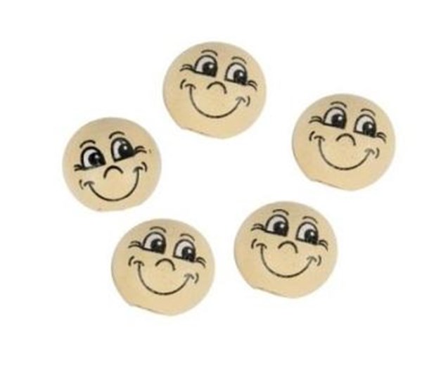 Træperle med halvboret hul, malet lys hudfarve og glad ansigt.